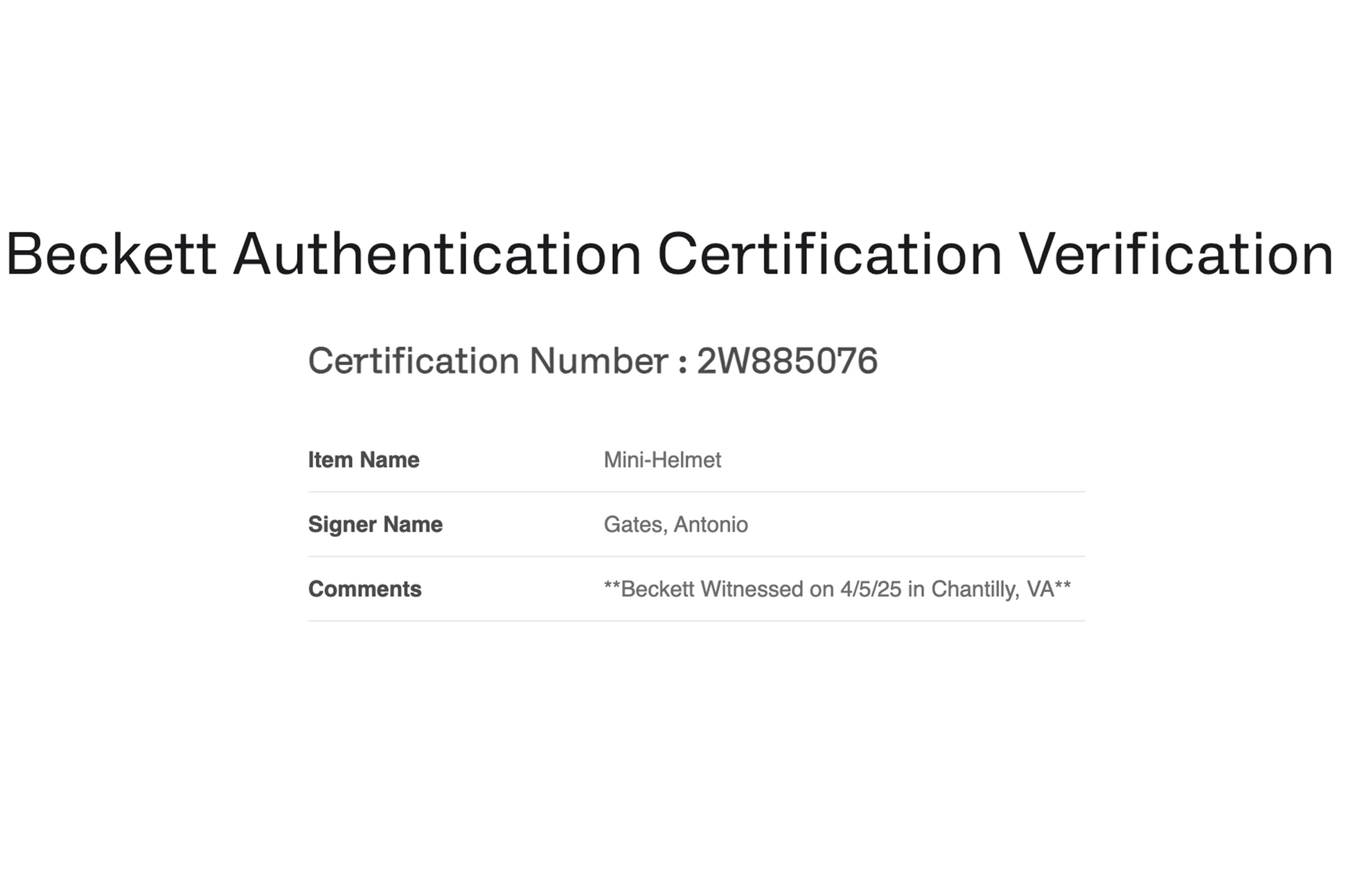 This Autographed San Diego Chargers Mini Helmet has been Personally Signed by Antonio Gates of the San Diego Chargers. This item is 100% Authentic and includes a Beckett Authentication Scannable QR Code and Numerical Sticker. A Beckett Authenticator witnessed the signing of this item on 4/5/2025 in Chantilly, VA.