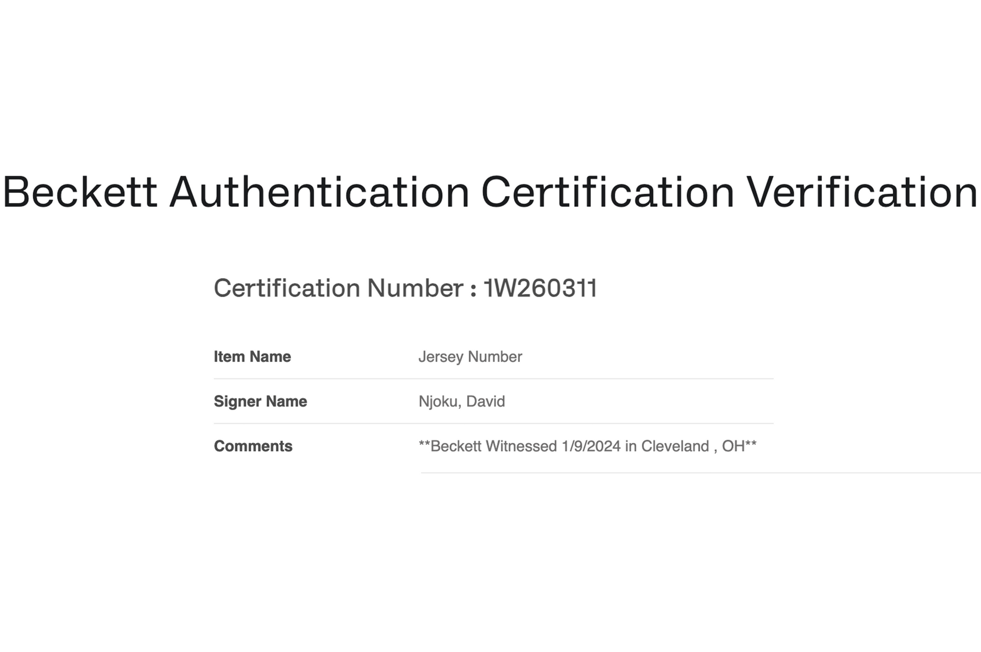 This Autographed Custom XL White Cleveland Jersey has been Personally Signed by David Njoku of the Cleveland Browns. This item is 100% Authentic and includes a Beckett Authentication Scannable QR Code and Numerical Sticker. A Beckett Authenticator witnessed the signing of this item on 1/9/2024 in Cleveland, OH.