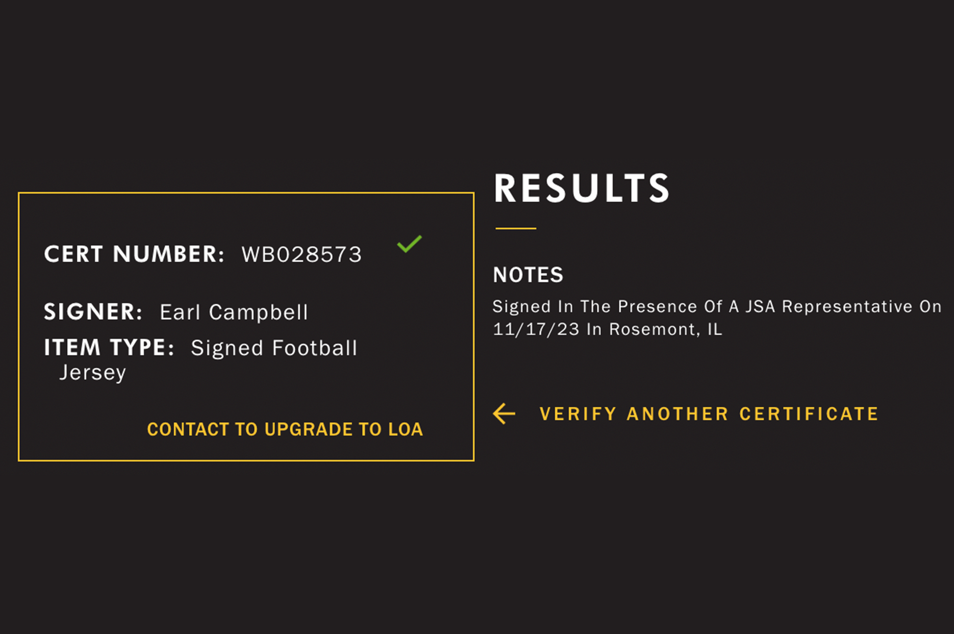This Autographed Custom XL White Houston Jersey has been Personally Signed by Earl Campbell of the Houston Oilers. This item is 100% Authentic and includes a James Spence Authentication Numerical Sticker. A JSA Authenticator witnessed the signing of this item on 11/17/2023 in Rosemont, IL.