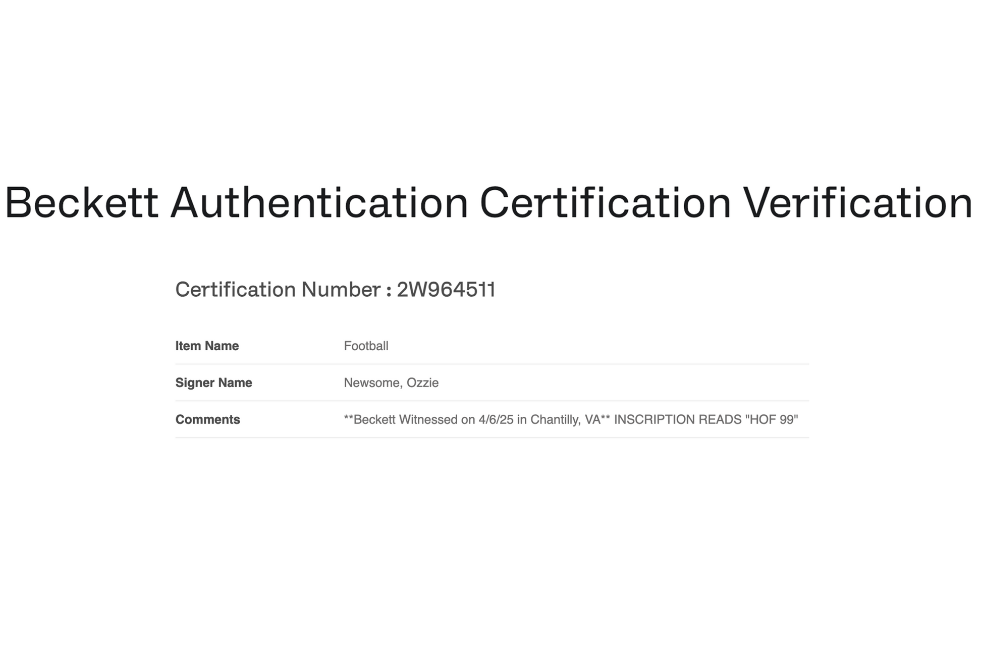 This Autographed football has been Personally Signed by Ozzie Newsome of the Cleveland Browns. This item is 100% Authentic and includes a Beckett Authentication Scannable QR Code and Numerical Sticker. A Beckett Authenticator witnessed the signing of this item on 4/6/2025 in Chantilly, VA.