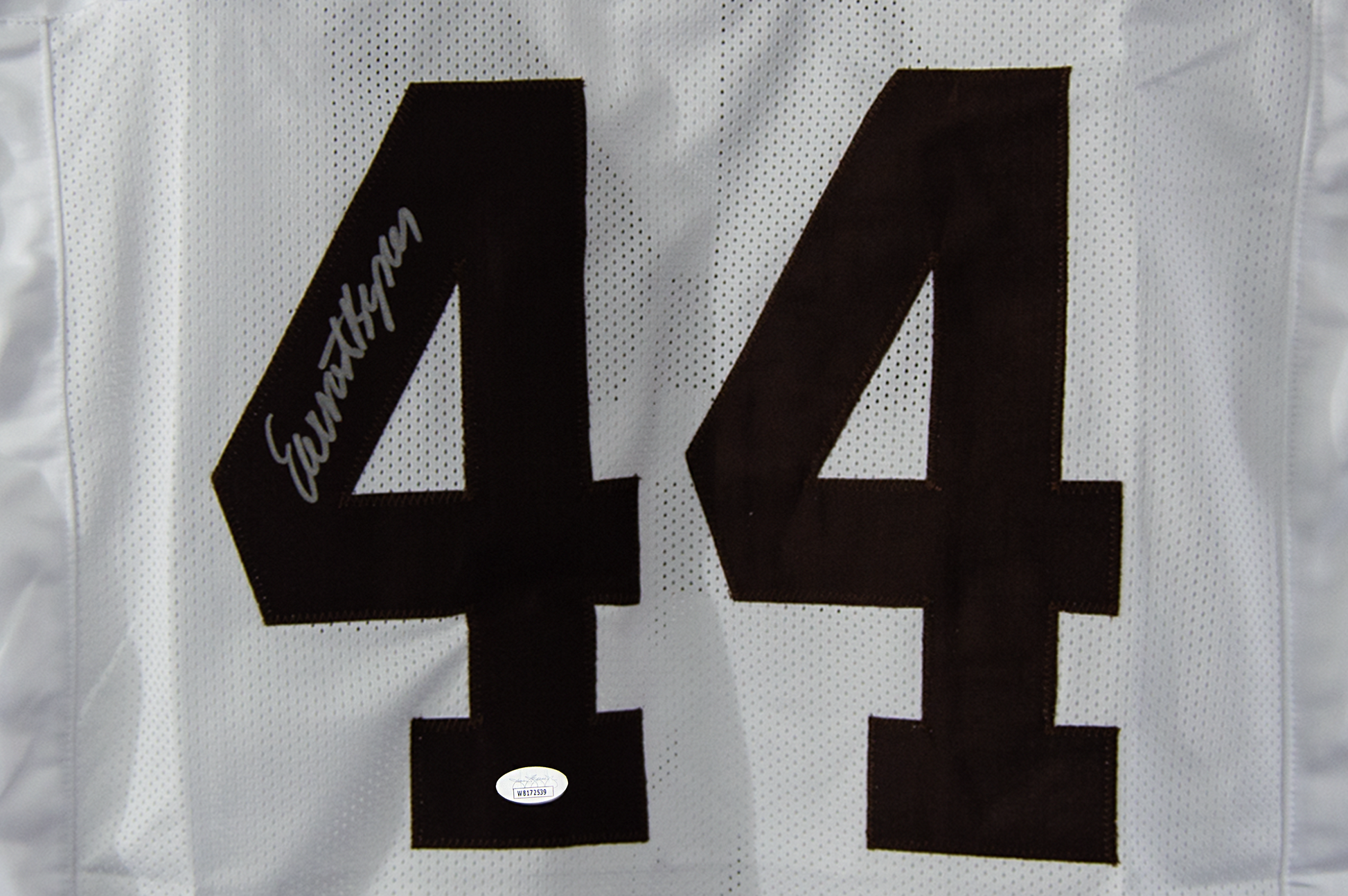 This Autographed Custom XL White Cleveland Jersey has been Personally Signed by Ernest Byner of the Cleveland Browns. This item is 100% Authentic and includes a James Spence Authentication Numerical Sticker. A JSA Authenticator witnessed the signing of this item on 3/22/2024 in Nashville, TN.