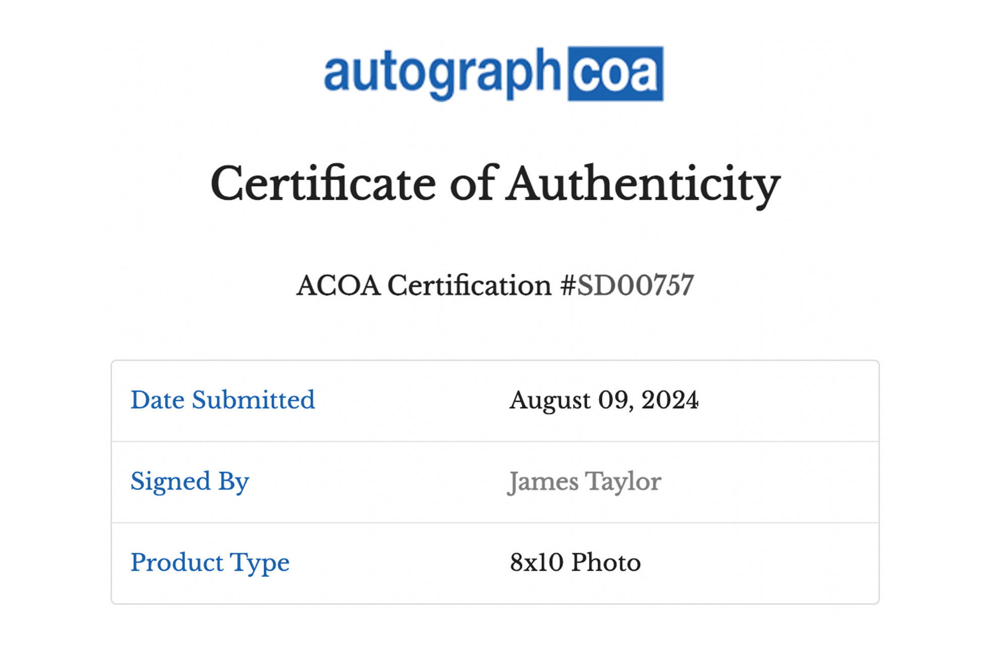 This autographed James Taylor Picture has been Personally Signed by James Taylor. This item is 100% Authentic and includes an AutographCOA Numerical Authentication Sticker.
