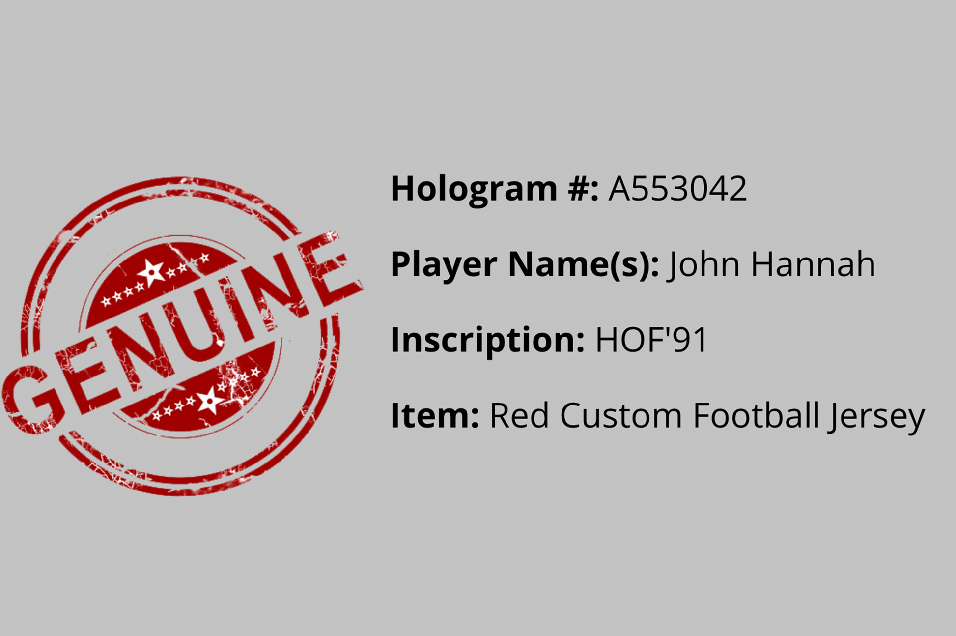 This Autographed Custom XL Red New England Jersey has been Personally Signed by John Hannah of the New England Patriots. This item is 100% Authentic and includes a Schwartz Sports Authentication hologram.