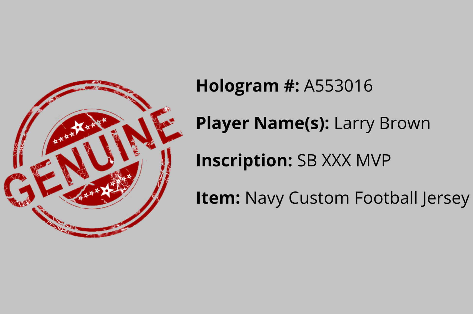 This Autographed Custom XL Blue Dallas Jersey has been Personally Signed by Larry Brown of the Dallas Cowboys. This item is 100% Authentic and includes a Schwartz Sports Authentication Numerical Authentication Sticker.