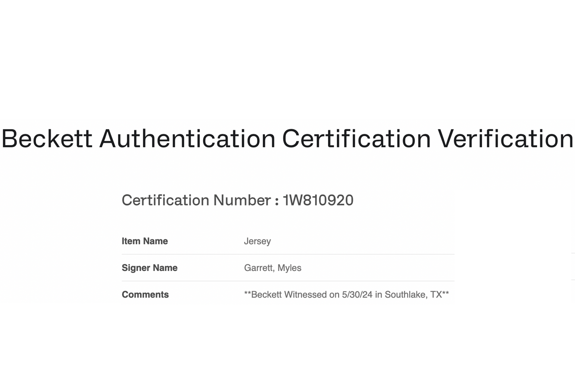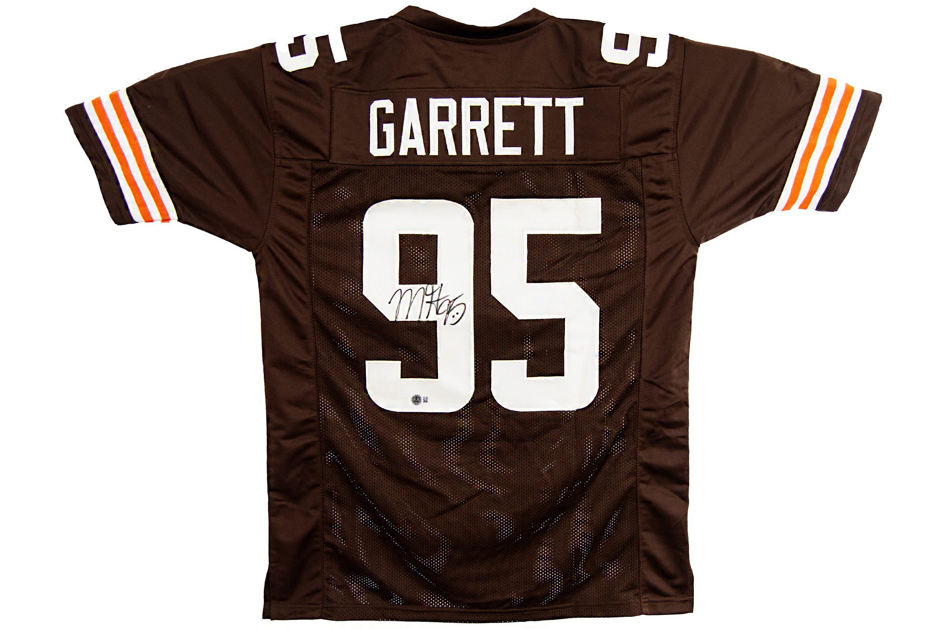 This Autographed Custom XL Brown Cleveland Jersey has been Personally Signed by Myles Garrett of the Cleveland Browns. This item is 100% Authentic and includes a Beckett Authentication Scannable QR Code and Numerical Sticker. A Beckett Authenticator witnessed the signing of this item on 5/30/2024 in Southlake, TX.